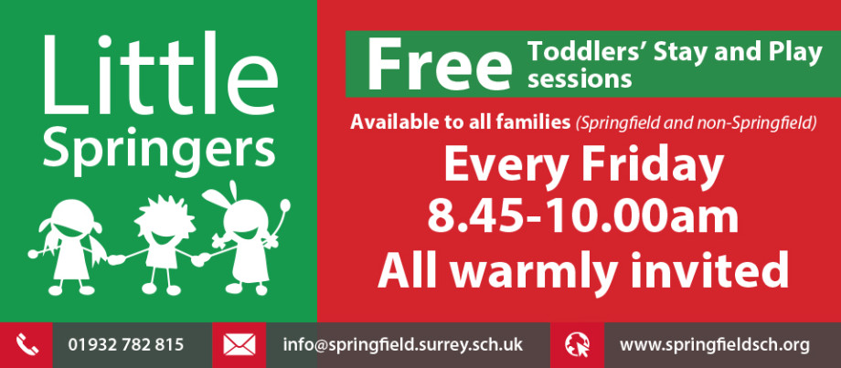 Little Springers sessions are held every Friday starting at 9.15am, for 1 hour and can be booked via email: info@springfield.surrey.sch.uk or by telephone: 01932 782 815. Families do not need to have a child already attending the school to join the group. Each session provides children with the opportunity to play and learn in our Nursery and for families to begin to build networks with other parents.